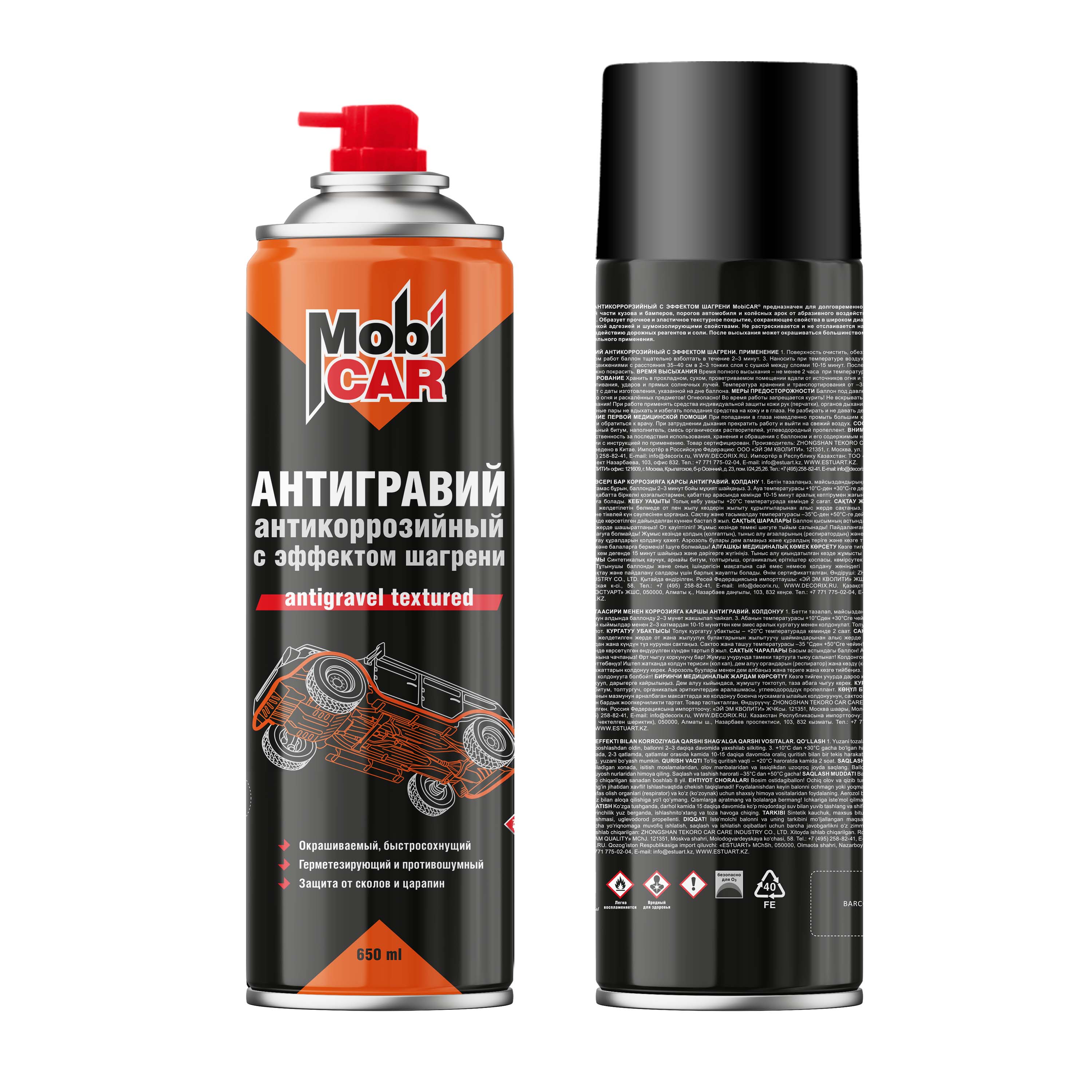 АНТИГРАВИЙ АНТИКОРРОЗИЙНЫЙ С ЭФФЕКТОМ ШАГРЕНИ MobiCAR® предназначен для долговременной антикоррозийной защиты нижней части кузова и бамперов, порогов автомобиля и колёсных арок от абразивного воздействия песка и ударов мелкого гравия. Образует прочное и эластичное текстурное покрытие, сохраняющее свойства в широком диапазоне температур. Обладает высокой адгезией и шумоизолирующими свойствами. Не растрескивается и не отслаивается на морозе. Покрытие устойчиво к воздействию дорожных реагентов и соли. После высыхания может окрашиваться большинством эмалей. Идеально для самостоятельного применения.