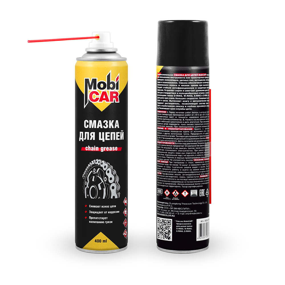 Профессиональная смазка для цепей MobiCAR® предназначена для смазывания инструмента или транспортных средств с цепным приводом: велосипедов, цепных пил, мотоциклов, мопедов, снегоходов и газонокосилок. Смазка обеспечивает отличную защиту от механического износа и низкое трение при высоких нагрузках. Создаёт стойкую антифрикционную и защитную пленку против коррозии. Устраняет скрип и смягчает движение цепи. Предназначена для стандартных и кольцеобразных втулок с уплотнительными кольцами типов O-RING, W-RING, X-RING и Z-RING. Остается на цепи даже при очень больших скоростях. Защищает цепь от воды, песка и грязи. Вытесняет влагу с металлических поверхностей. Содержит растворитель, позволяющий составу при нанесении смыть отработанную смазку и глубоко проникнуть между звеньями. Увеличивает срок службы цепи.