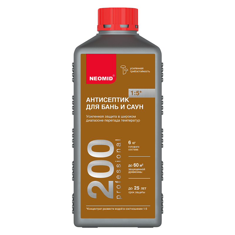 NEOMID 200 – антисептическая пропитка для защиты древесины внутри бань и саун, включая полки и скамейки, в условиях частого перепада температур и повышенной влажности.